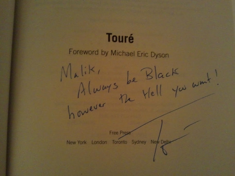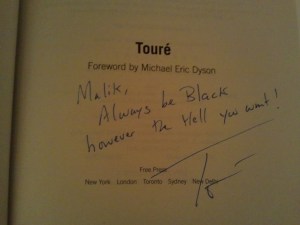 ‘Post-Black’ as Toure means it (or as I interpret it), is meant to represent the post Civil Rights generation that is undeniably proud of being Black, but at the same time want the freedom to say, ‘But that’s not all I am.” In the book and in discussions he often uses the talking point of ‘what Black people don’t do’ which is part of it, but the full defintion of this should also include ‘what Black people aren’t.’ He goes into the ‘talking white’ point and ‘the closer you are to the ghetto the Blacker you are’ myths; to my point I think he could have gone deeper into how many interracial people and gays have to deal with the identity crisis of ‘You’re not really Black” or “the Black community will not accept who you are”. Moving on…